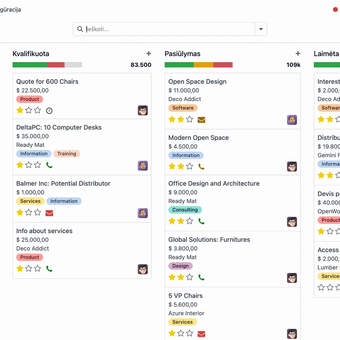 Pilnas pardavimo proceso valdymas nuo pirmos užklausos iki sąskaitos išrašymo. Valdykite užklausas, pasiūlymus, pardavimo užsakymus, visą susietą informaciją ir komunikaciją.